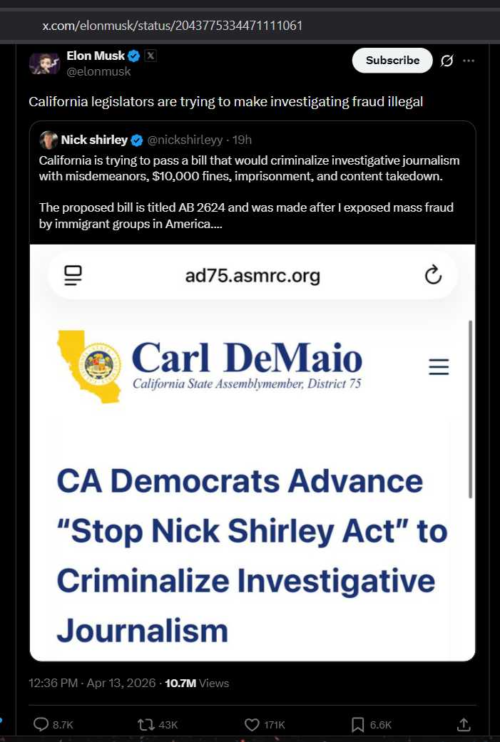 ....that THE WIFE of the CURRENT CA STATE ATTORNEY General has INTRODUCED a BILL in the Sacramento statehouse nicknamed "The NICK SHIRLEY Act" THAT WOULD OUTLAW INVESTIGATIVE JOURNALISM, that would MAKE INDEPENDENT journalists and INVESTIGATORS in TO CRIMINALS for simply REPORTING ON California CRIMES & CORRUPTION!!