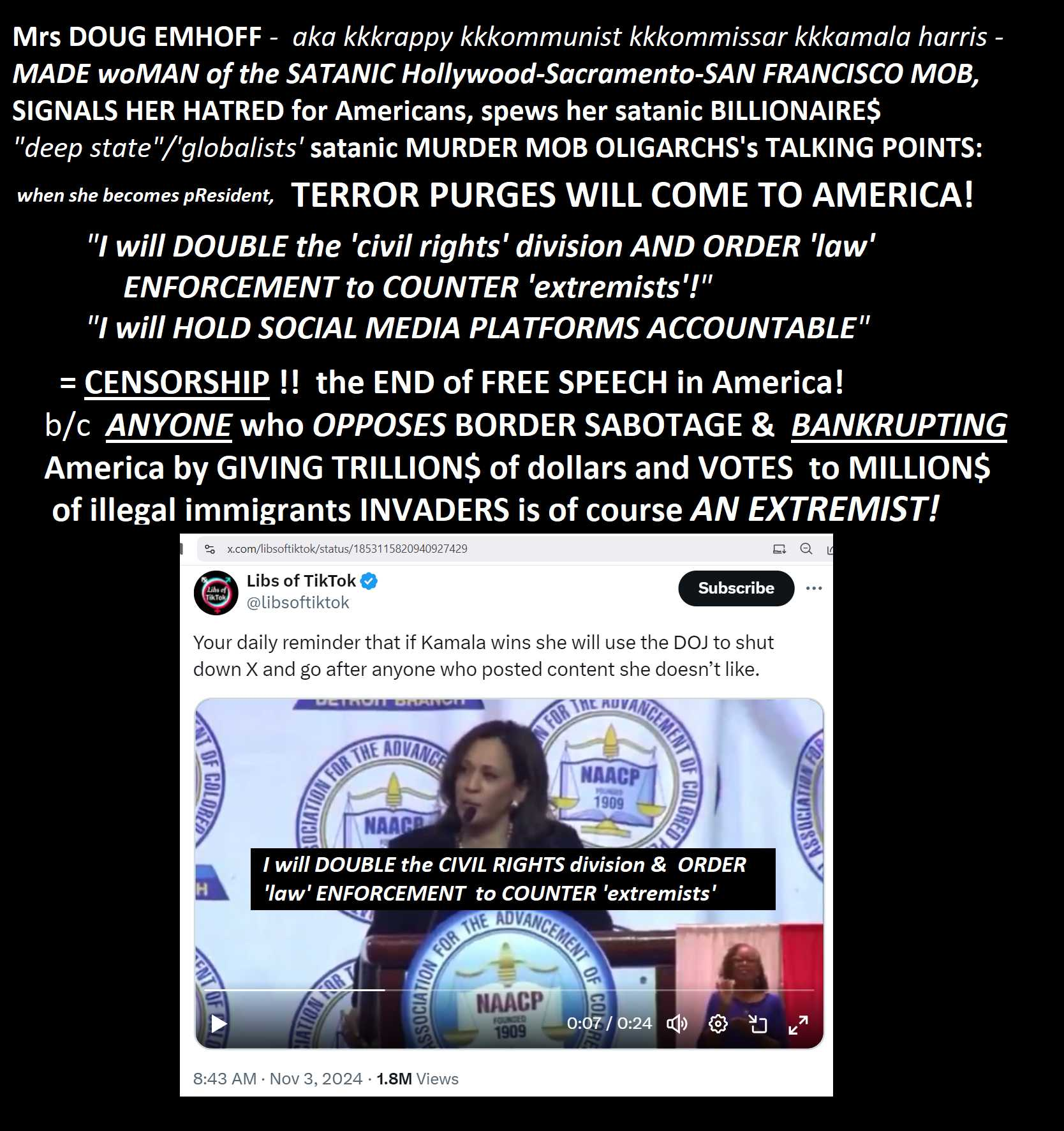 ...AND AS "MARRIED TO THE MOB" Mrs DOUG EMHOFF aka kkkrappy kkkommissar kkkmala THREATENED SHE WOULD DO IMMEDIATELY if installed as president in 2025 on her EVERY CAMPAIGN STOP in 2024 (image 2)