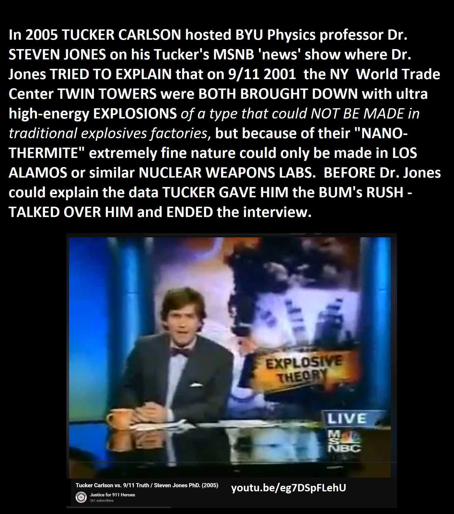 video 2: Tucker Carlson 2005 MSNBC interview with Dr. STEVEN JONES